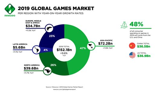 自2015年后,中国游戏市场取代美国市场成为全球最大的游戏市场。这一现象可能会在今年发生改变。据Newzoo近期发布的2019全球游戏市场报告预估,今年美国市场将会重回全球第一。