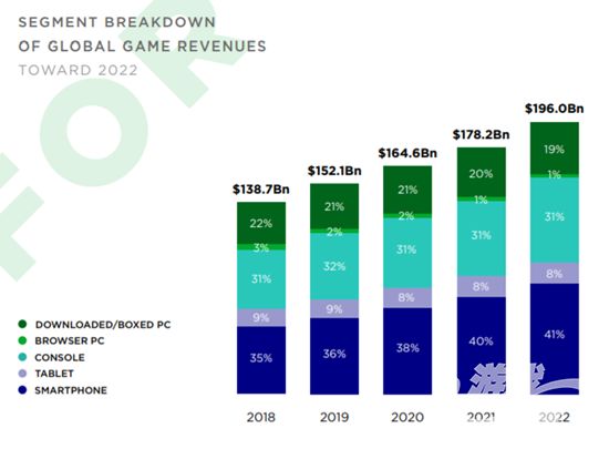 Newzoo预估到2022年时,各类游戏市场份额